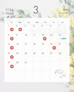 3月の休業日のお知らせ2026年02月21日NEW 当店のホームページをご覧いただき、ありがとうございます。 誠に勝手ながら、画像の通りお休みをいただきます。 季節の変わり目でお疲れが出やすい時期ですので、 お身体のメンテナンスにぜひご利用ください。 ご予約はWEBから24時間受付中です。 ご予約お待ちしております。 前のページに戻る