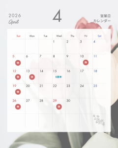 4月の休業日のお知らせ2026年03月24日NEW 当店のホームページをご覧いただき、ありがとうございます。 4月の休業日のお知らせです。 10日、13日は私用のためお休みいたします。 どうぞよろしくお願い申し上げます。 前のページに戻る